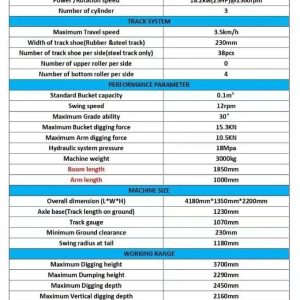 - Maximum bucket digging force of 15.3KN and maximum arm digging force of 10.5KN.