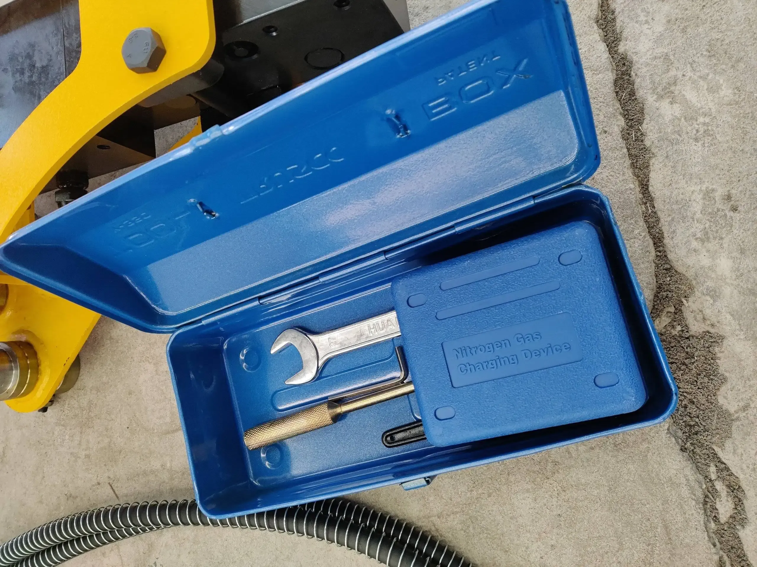Comes in a wooden box packaging that includes 1 hammer body, 2 drill rods, and 1 nitrogen cylinder, providing a comprehensive solution for your hydraulic hammer needs.